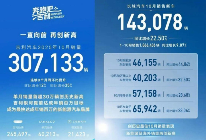 随后,长城汽车与吉利汽车也先后发布最新销量,长城汽车单月销量超14.3万辆,创历史最佳10月销量表现;吉利汽车10月份销量超30.7万辆,首次单月销量突破30万辆。